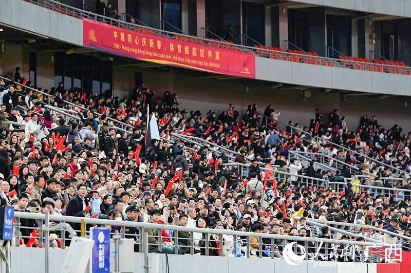 天色渐暗,广西体育中心喷泉广场灯光亮起。距离首届中国广西与越南广宁、谅山、高平、宣光、海防五省市新春足球赛开赛还有1个小时,场外东说念主流汇注——携幼扶老的市民、举着加油棒的球迷、领着购物袋的旅客......